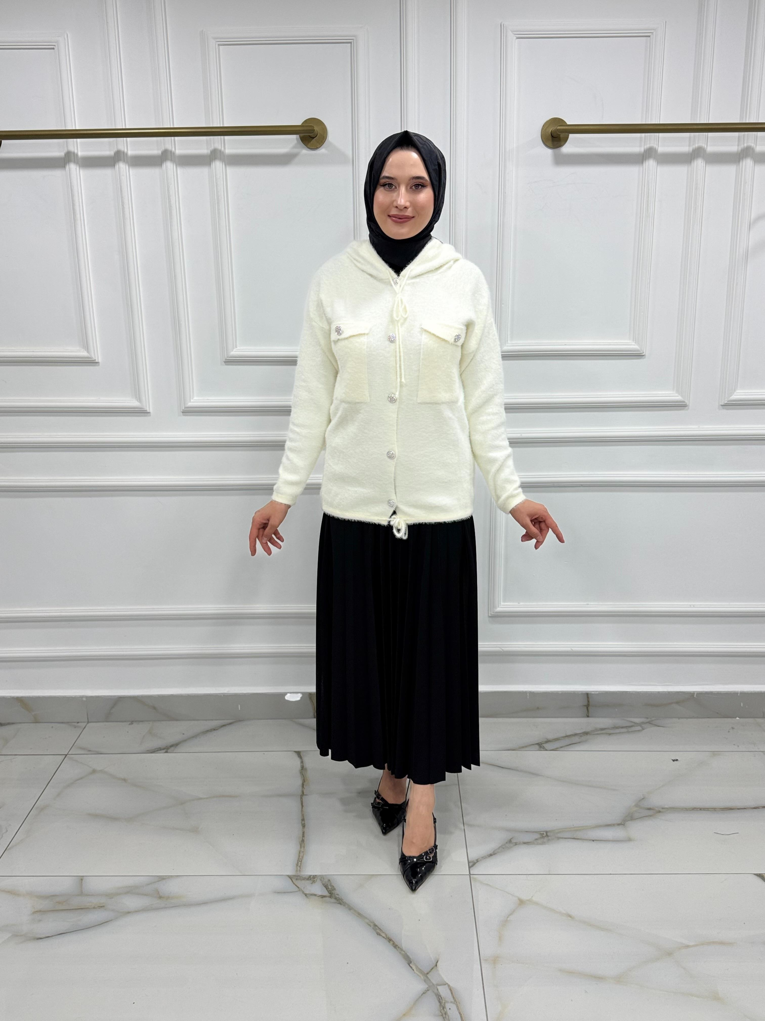 2470 YUMOŞ KAPŞONLU BOYDAN DÜĞMELİ HIRKA KREM (2470)