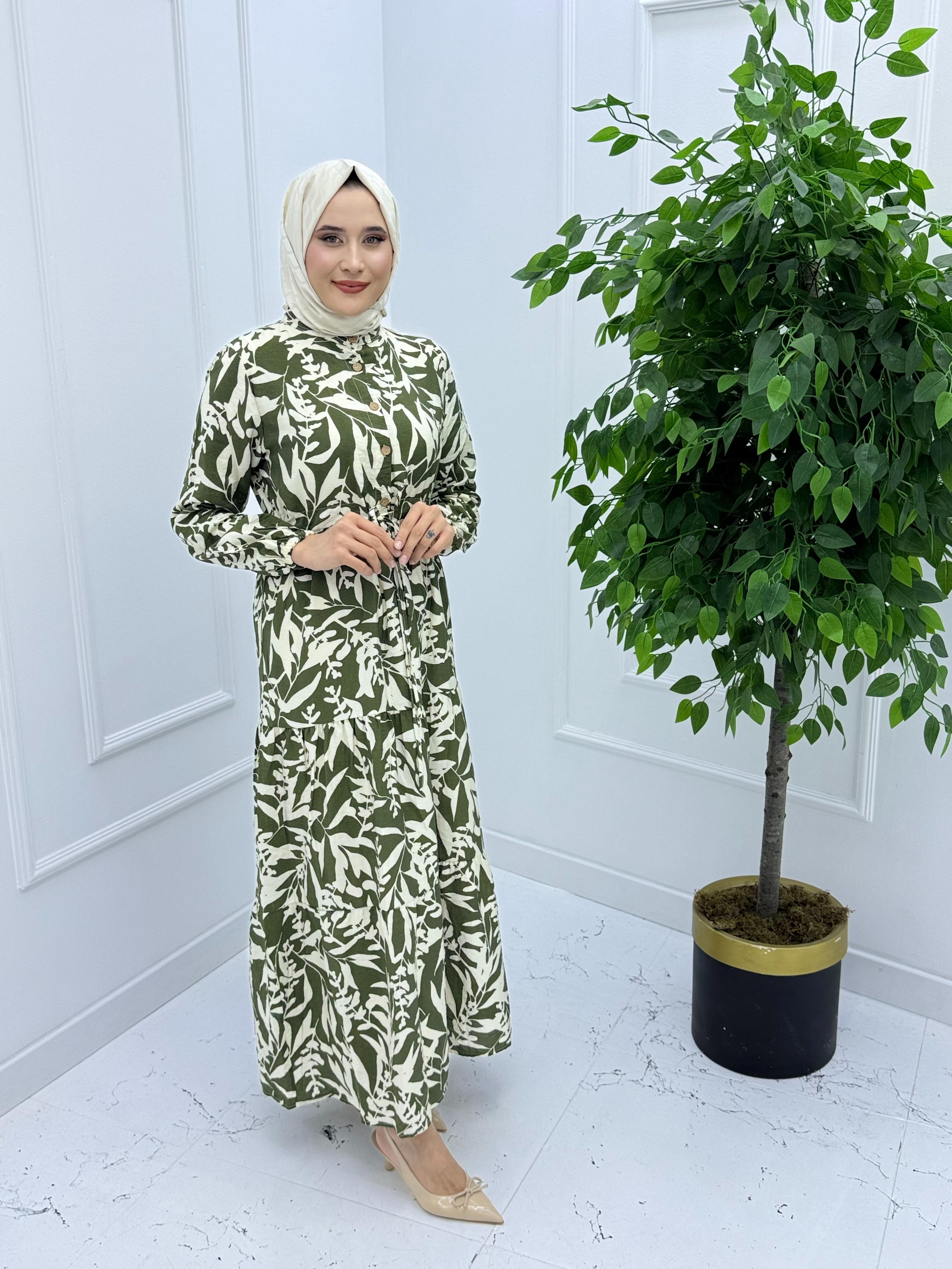 7580 KAŞ KUMAŞ YARIYA KADAR DÜĞMELİ BELDEN BAĞLAMALI ÇİLEK ELBİSE HAKİ YEŞİL (7580)