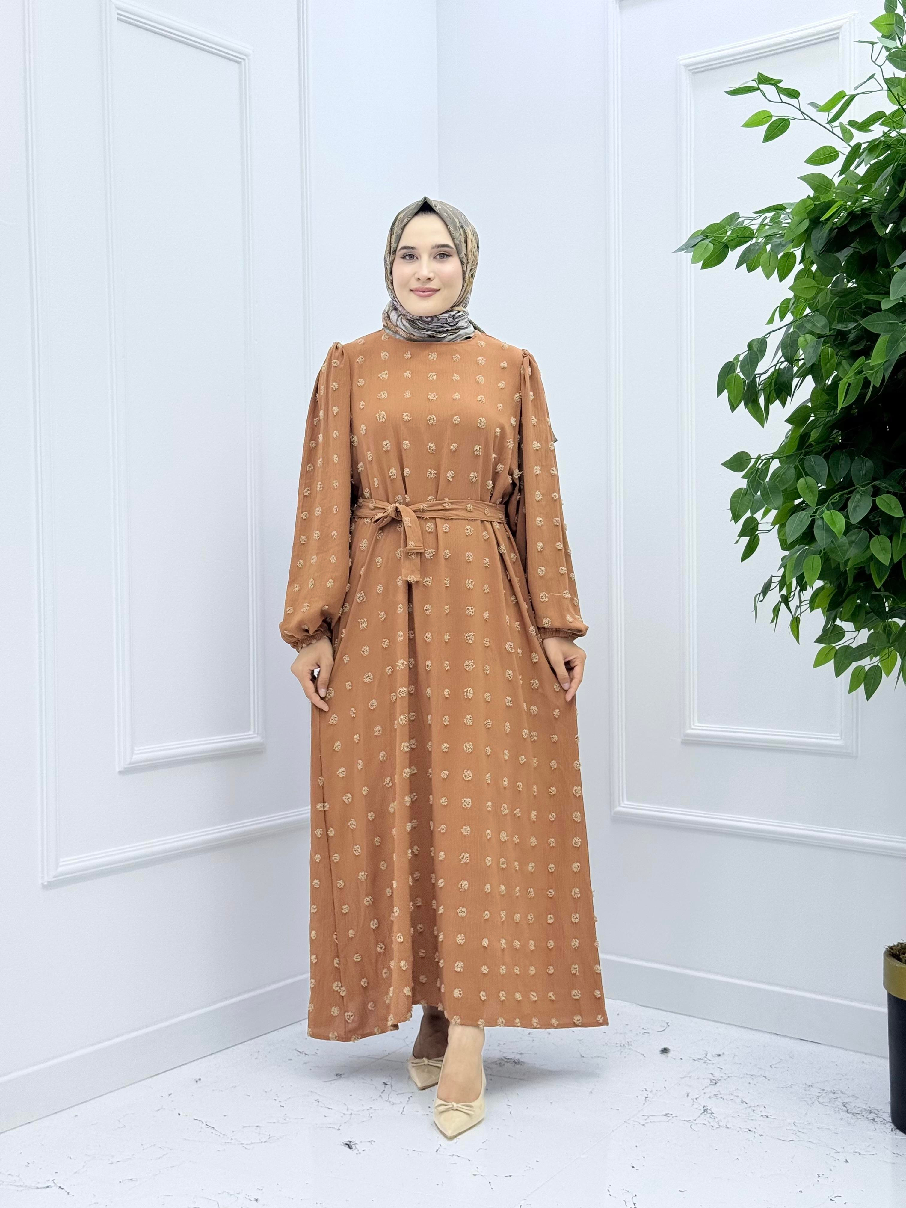 1206 SEYYAR KEMERLİ AYROBİN KUMAŞ DÜZ ELBİSE KİREMİT (1206 )