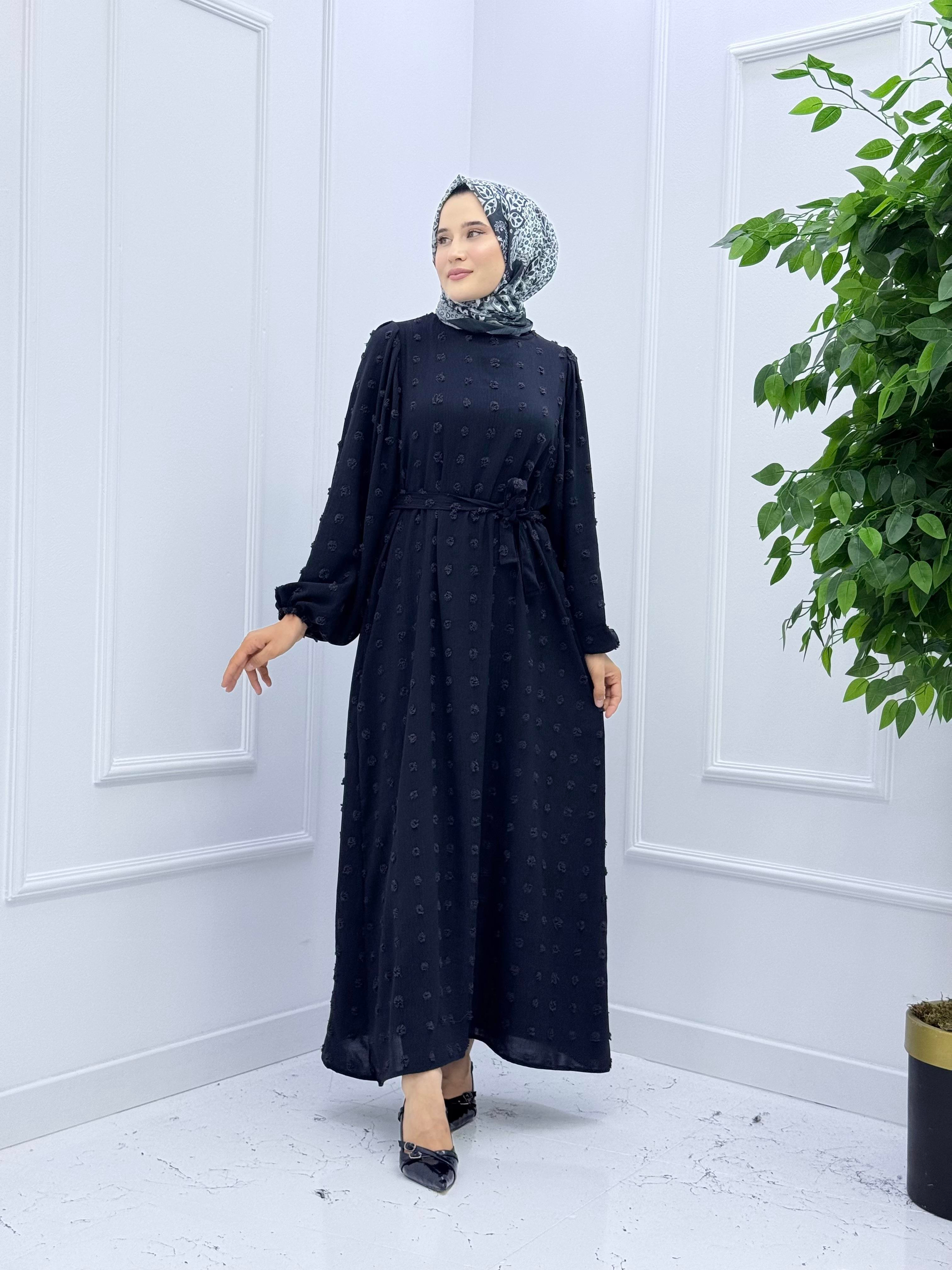 1206 SEYYAR KEMERLİ AYROBİN KUMAŞ DÜZ ELBİSE SİYAH