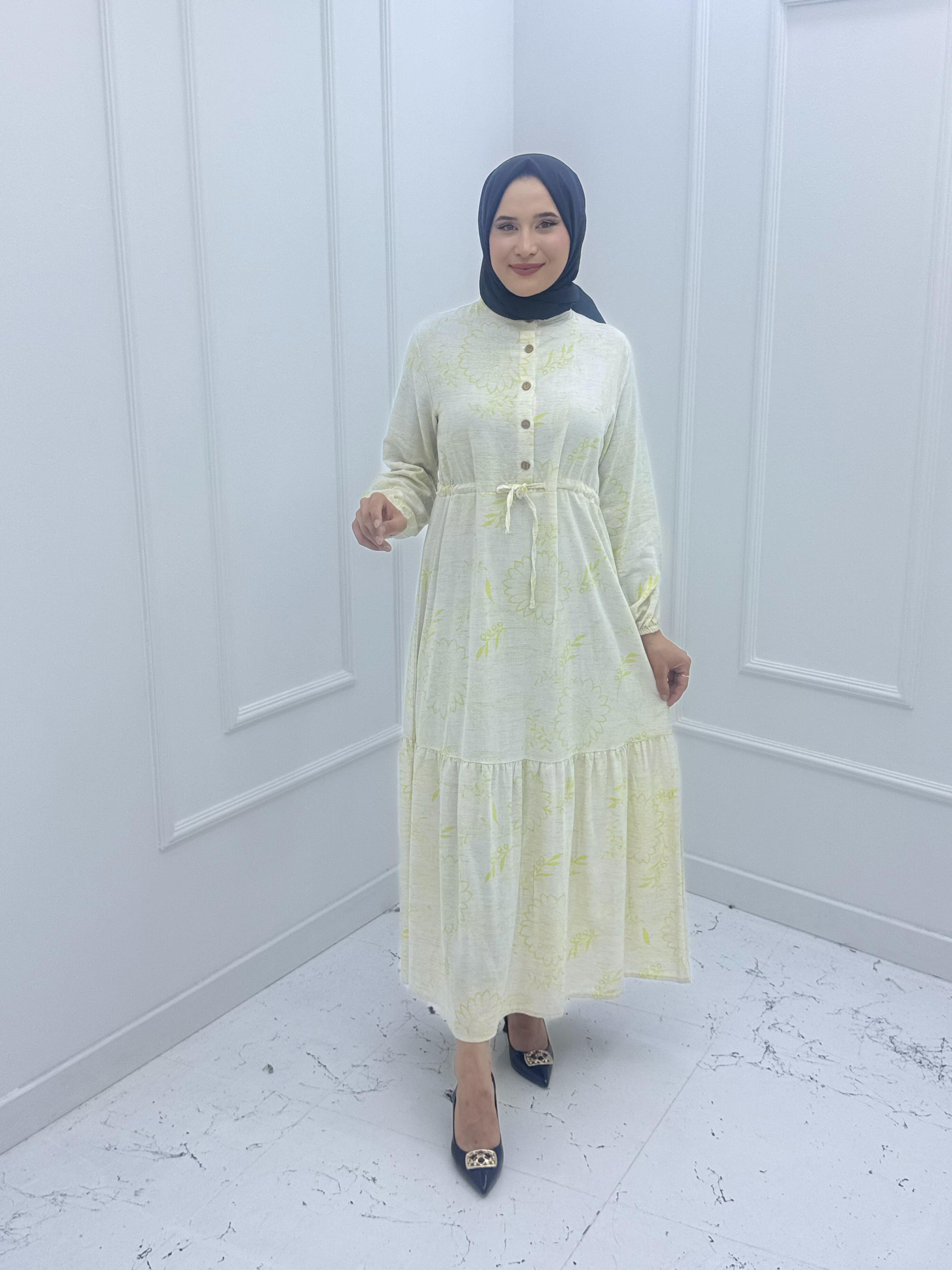 12084 KETEN VİSKON KUMAŞ ÇİÇEK DESENLİ ELBİSE SARI (12084)