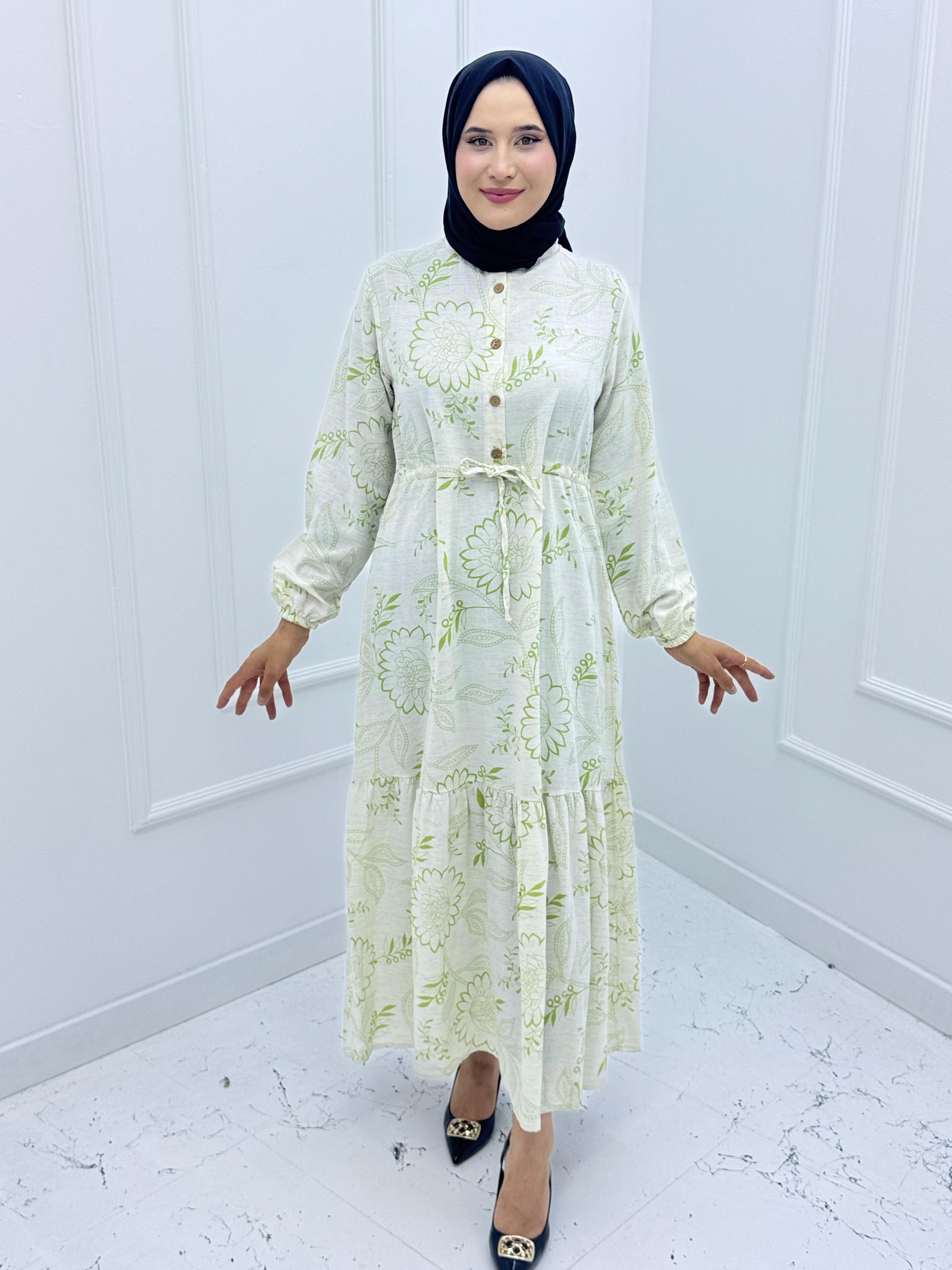 12084 KETEN VİSKON KUMAŞ ÇİÇEK DESENLİ ELBİSE YEŞİL