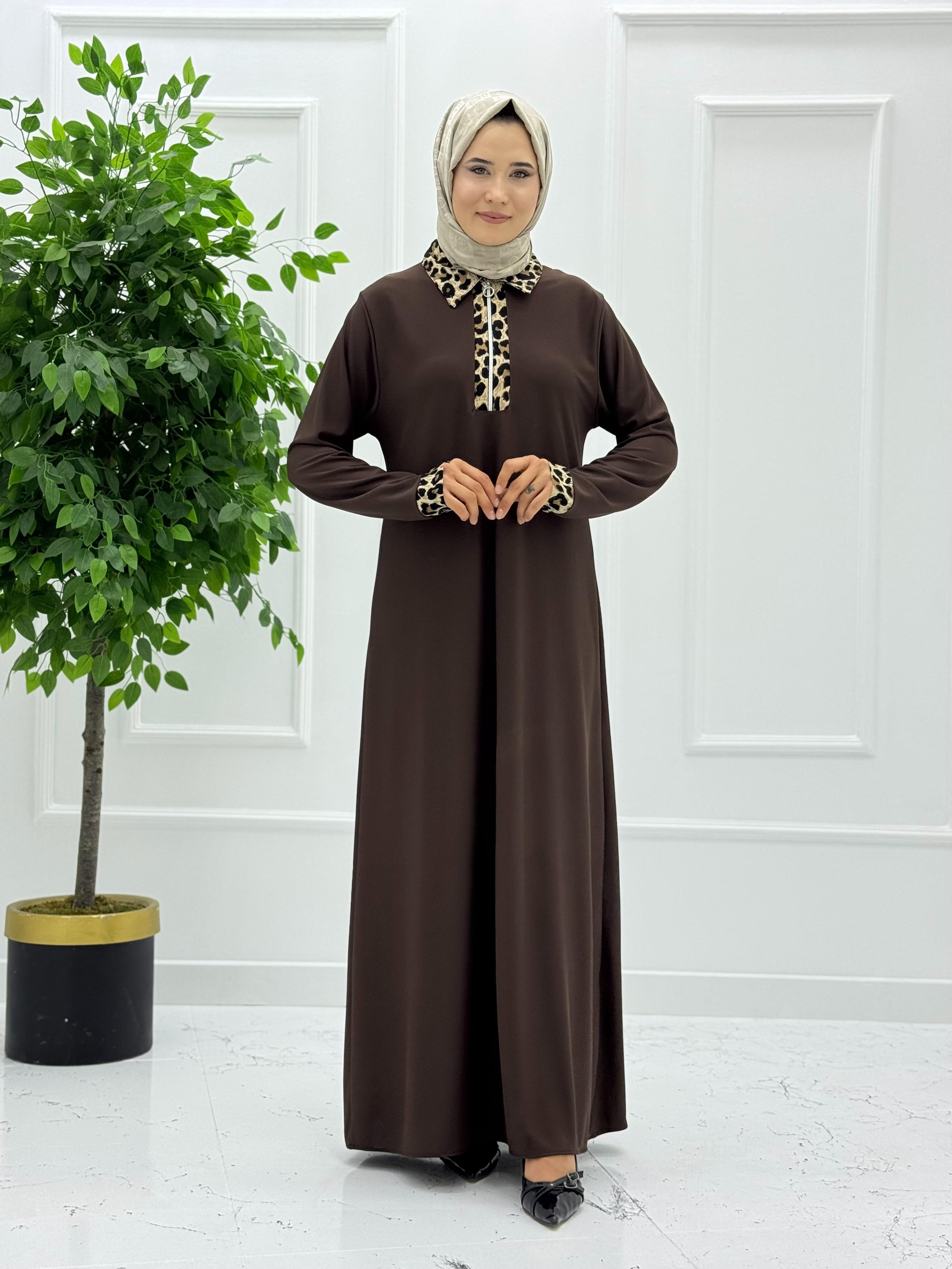 1550 boydan yakası fermuarlı leopar desenli elbise kahverengi (1550)