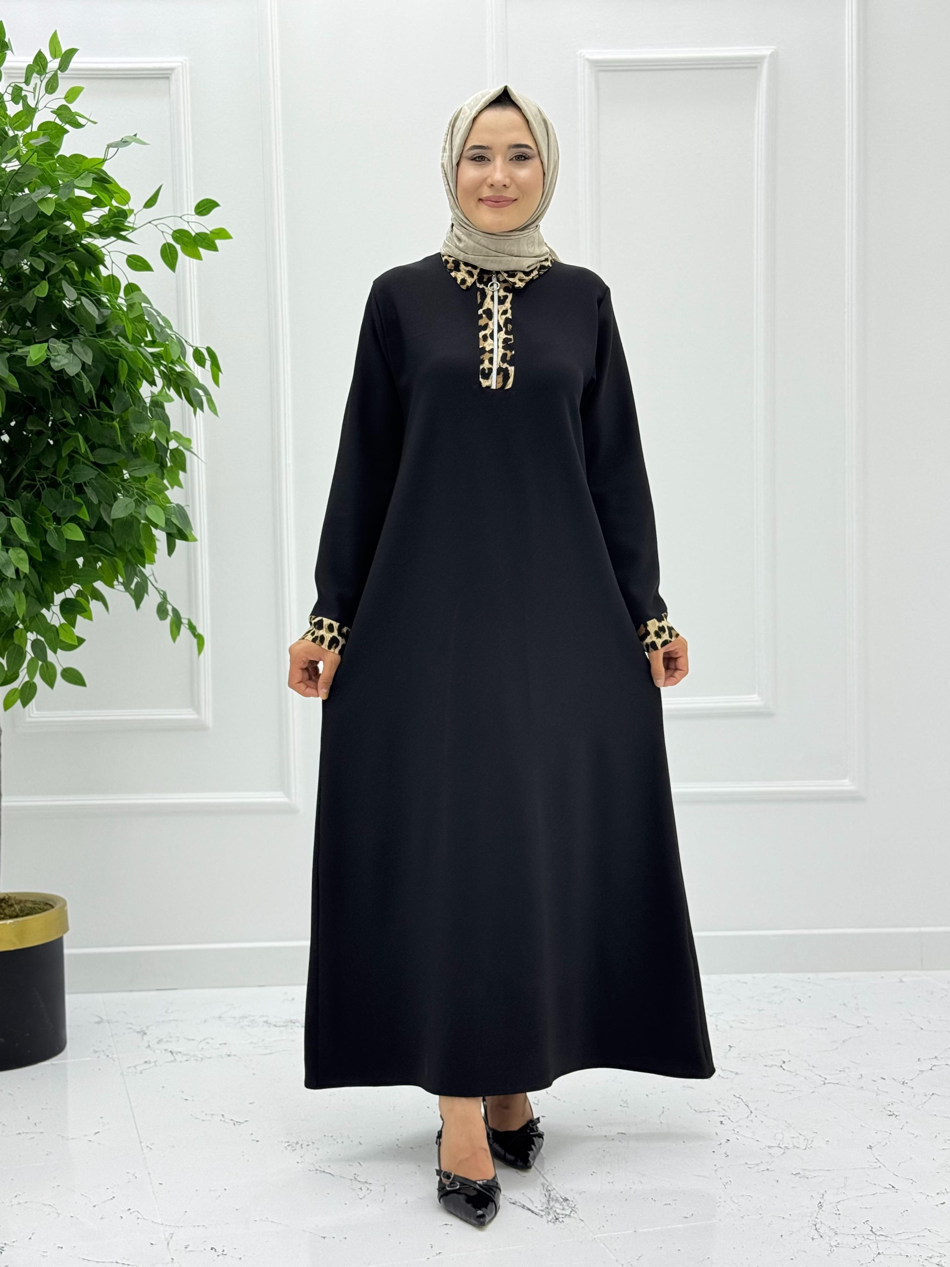 1550 boydan yakası fermuarlı leopar desenli elbise siyah (1550)