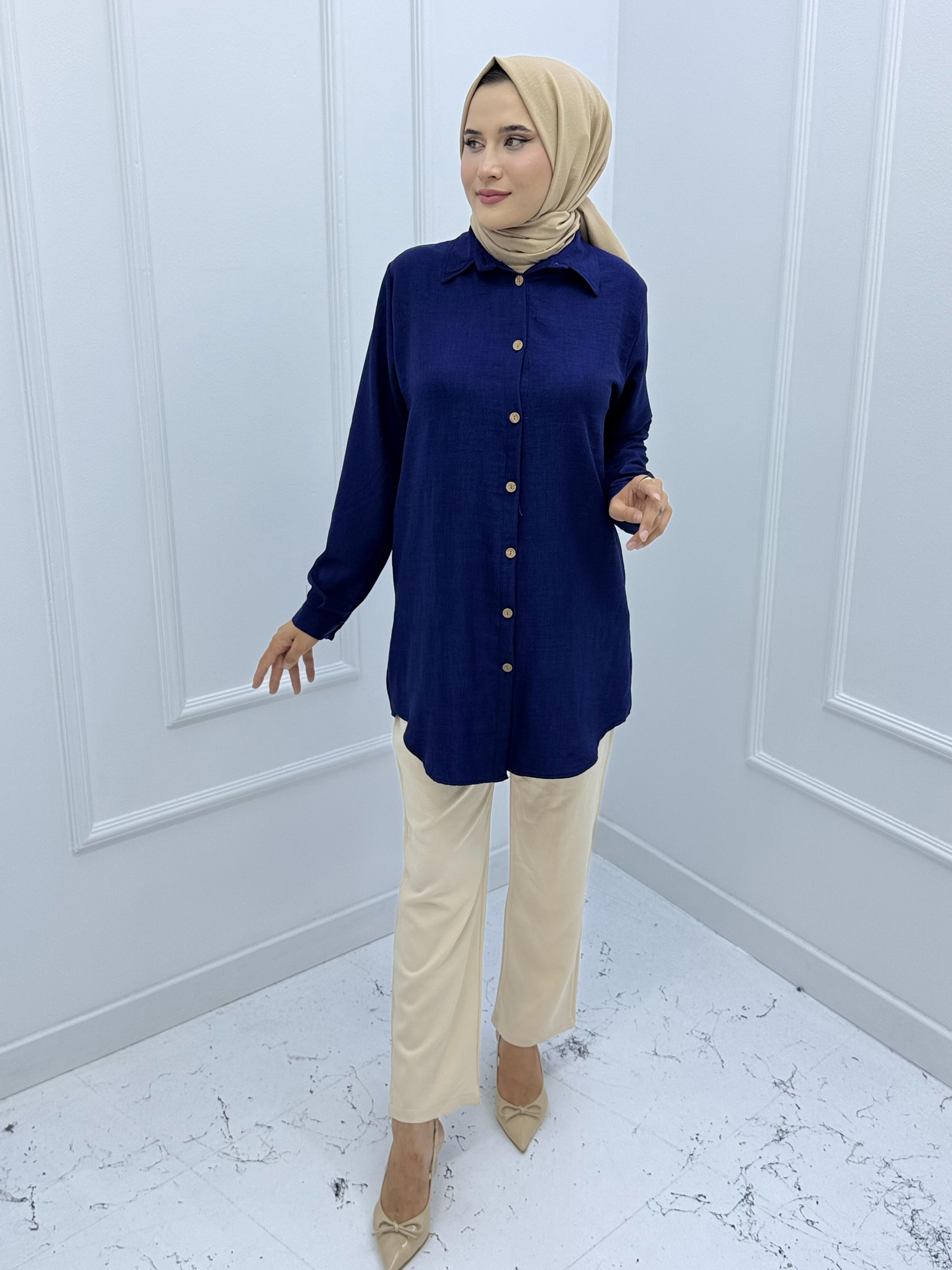 1702 SOFYA KETEN KUMAŞ BOYDAN DÜĞMELİ TUNİK GÖMLEK  LACİVERT