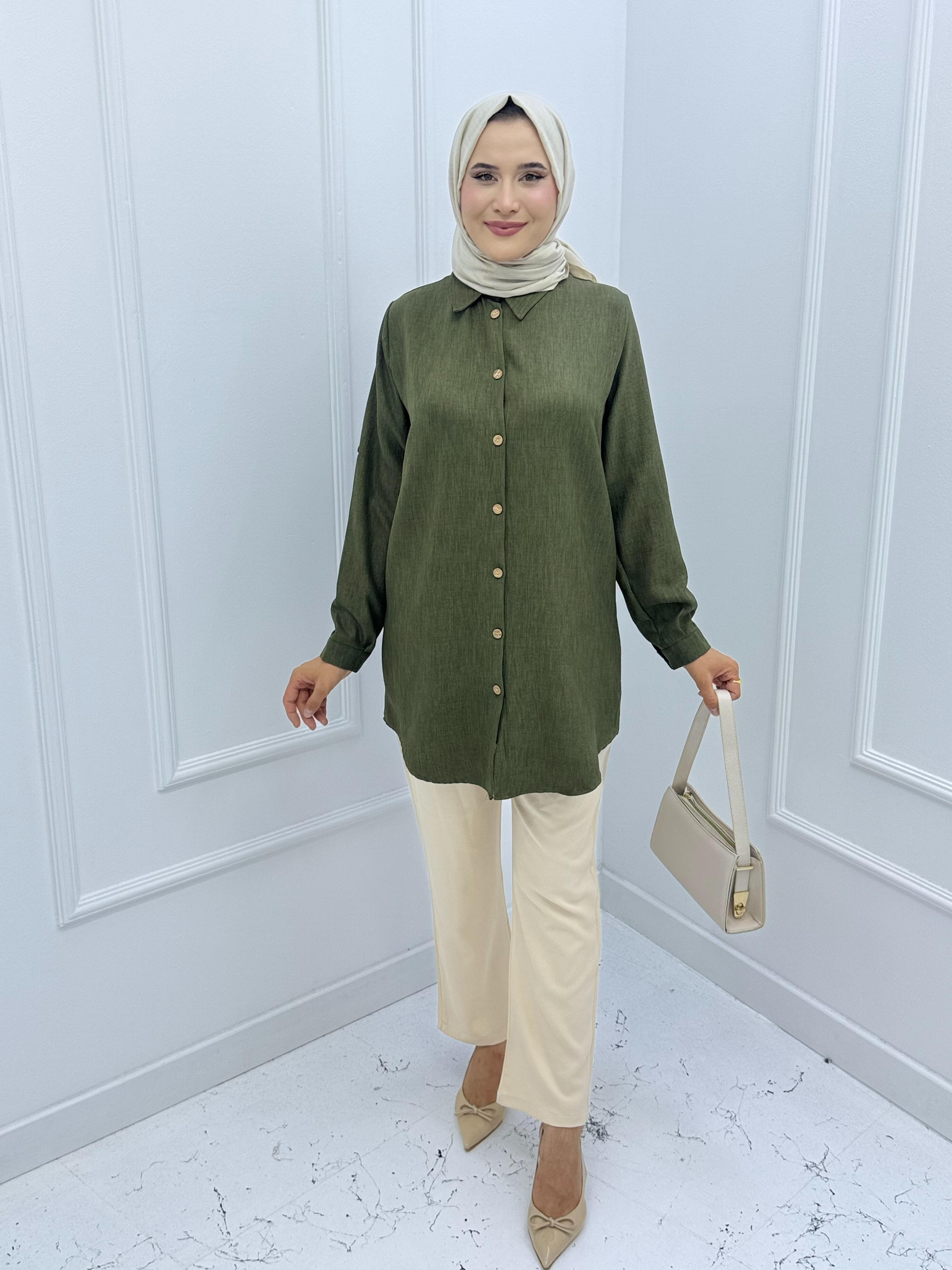 1702 SOFYA KETEN KUMAŞ BOYDAN DÜĞMELİ TUNİK GÖMLEK  YEŞİL (1702)