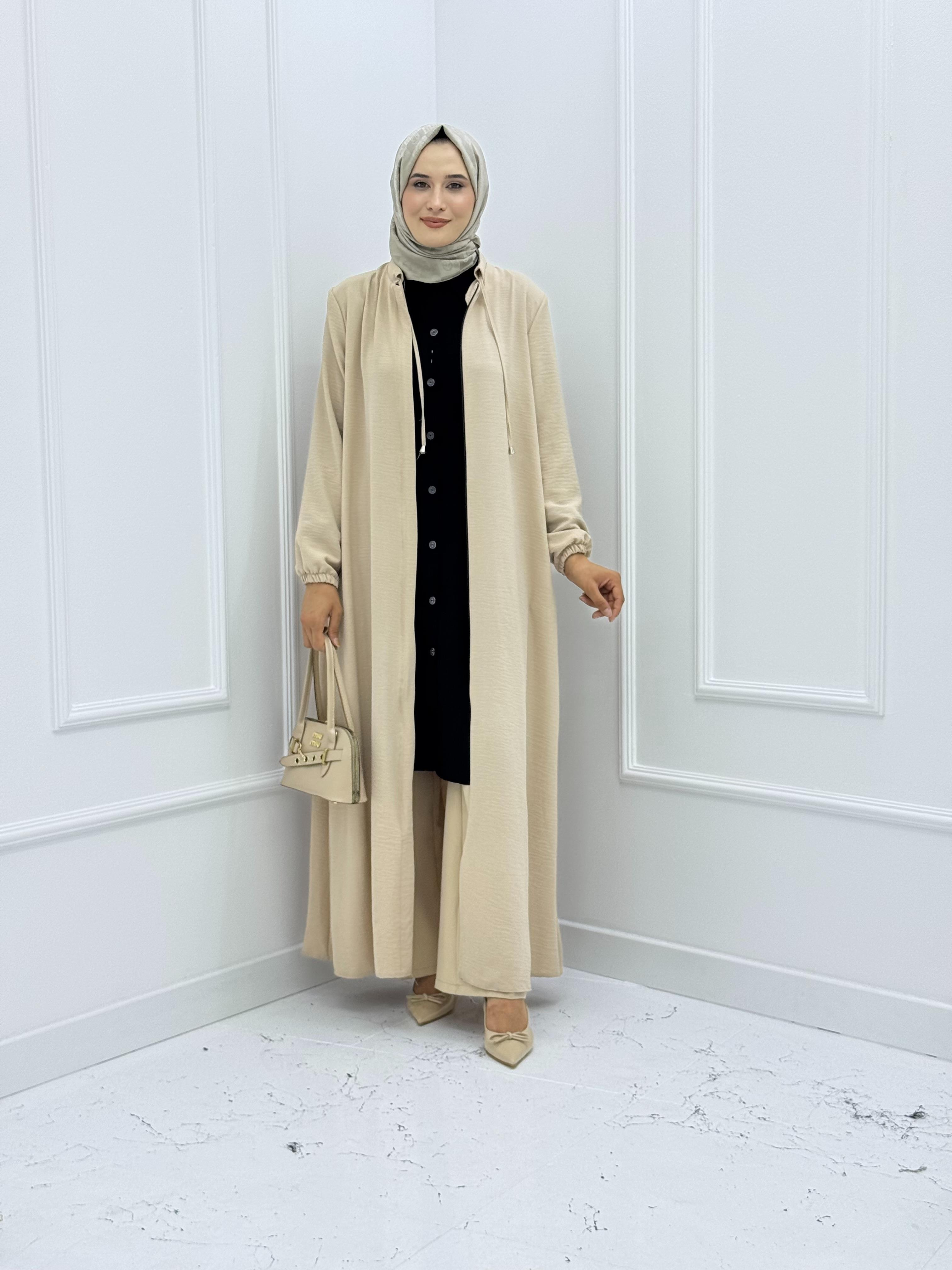 Ayrobin kumaştan üretilmiş, boydan fermuarlı ve düz renk tasarıma sahip bu ferace; hafif yapısı, dökümlü duruşu ve nefes alabilir dokusuyla hem şık hem de konforlu bir kullanım sunar. Günlük ya da özel kullanımlar için ideal, sade ve zarif bir tercihtir.