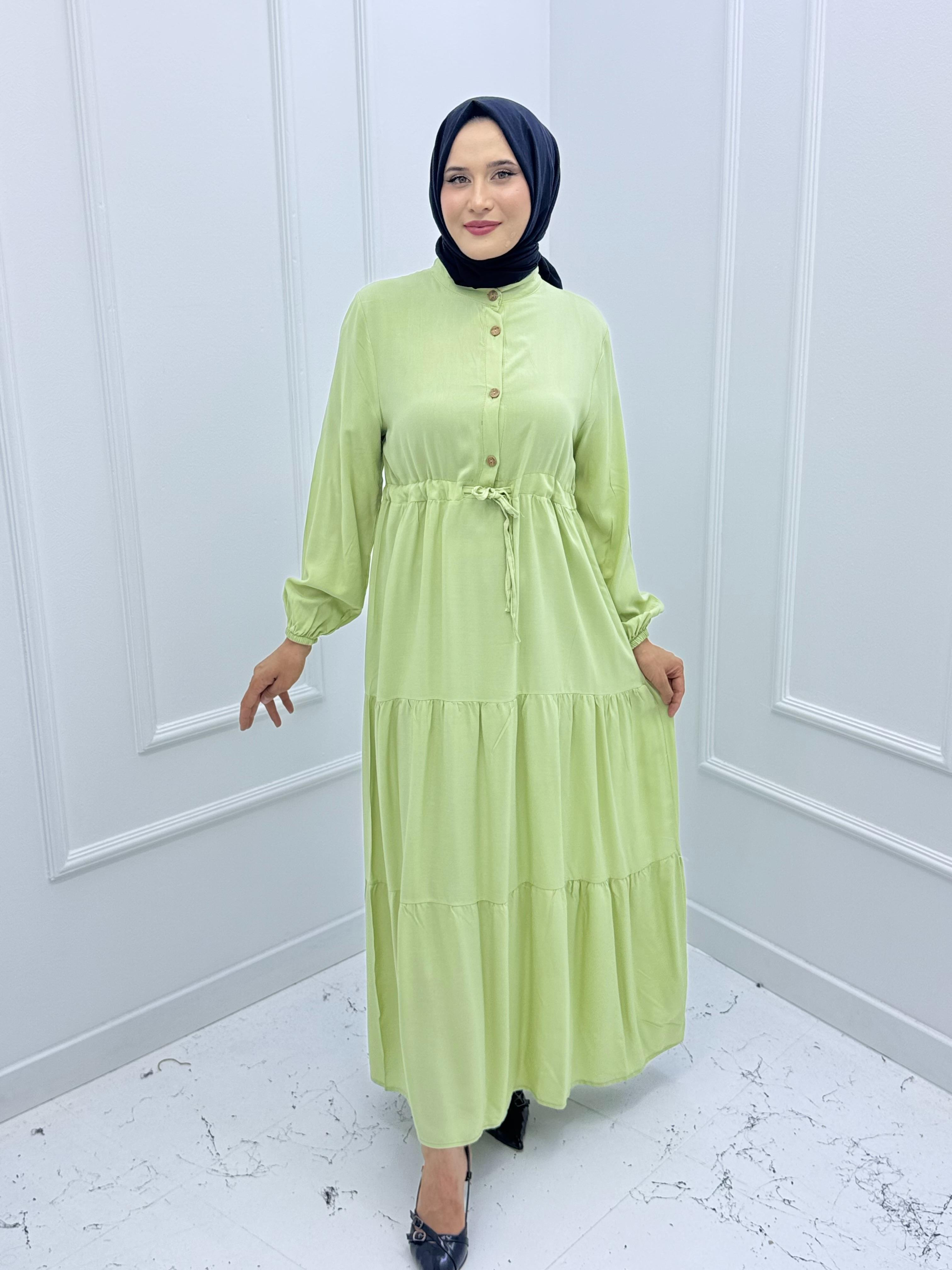 2390- PAMUK VİSKON KUMAjavascript:void(0)Ş BELDEN BAĞLAMALI YARIYA KADAR DÜĞMELİ ELBİSE AÇIK YEŞİL (2390)