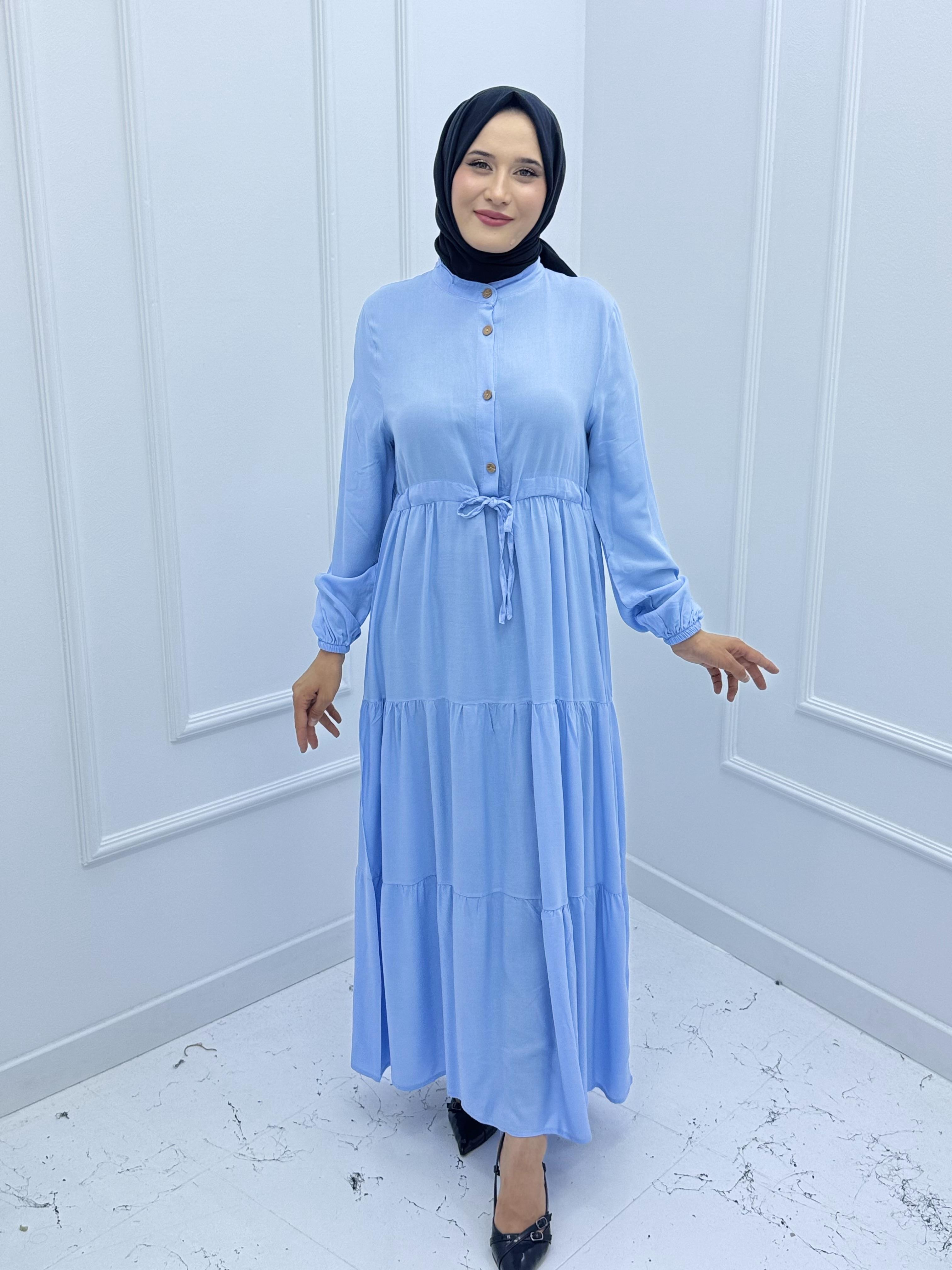 2390- PAMUK VİSKON KUMAŞ BELDEN BAĞLAMALI YARIYA KADAR DÜĞMELİ ELBİSE  BEBE MAVİSİ