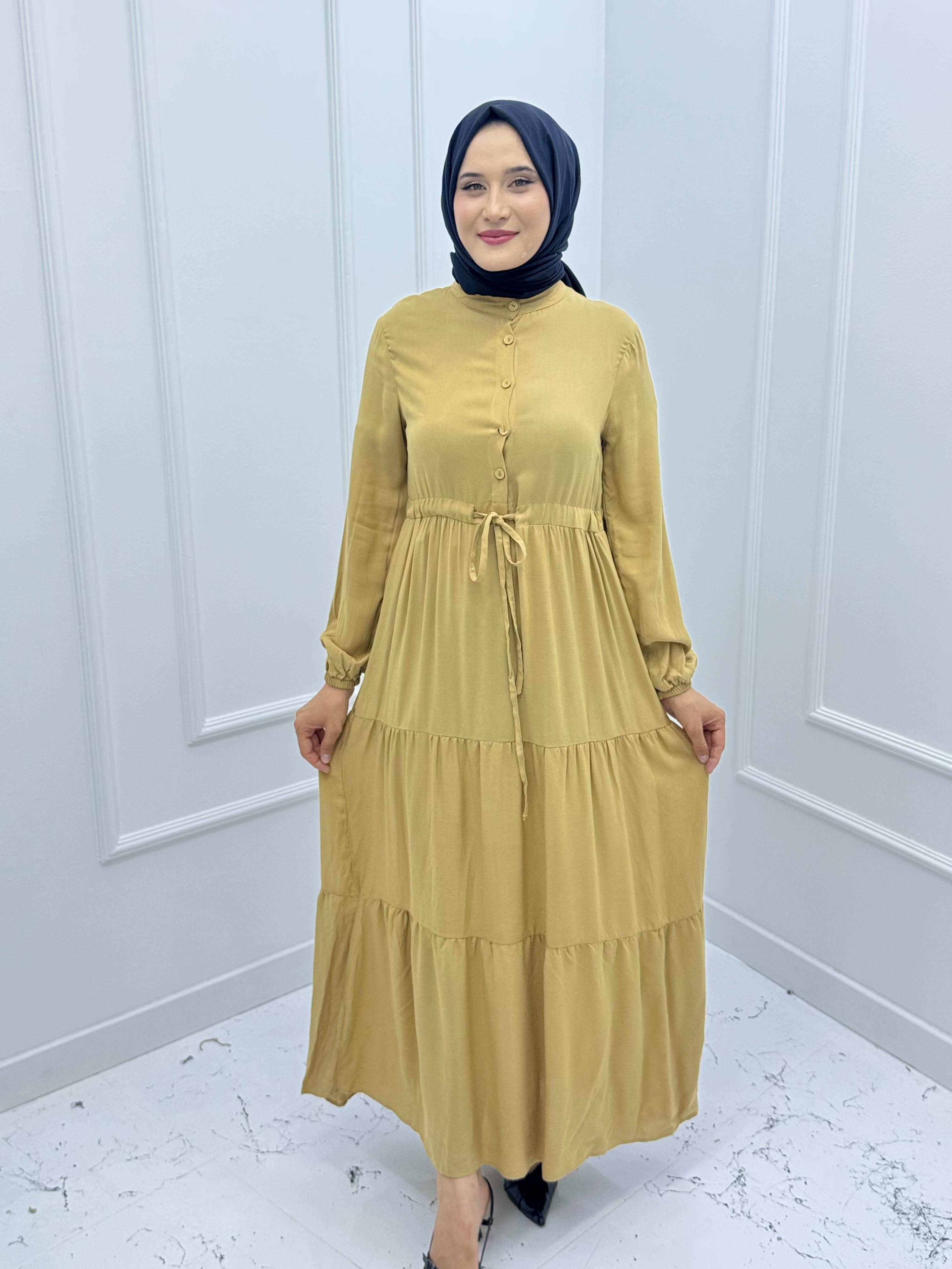 2390- PAMUK VİSKON KUMAŞ BELDEN BAĞLAMALI YARIYA KADAR DÜĞMELİ ELBİSE  SÜTLÜ KAHVE
