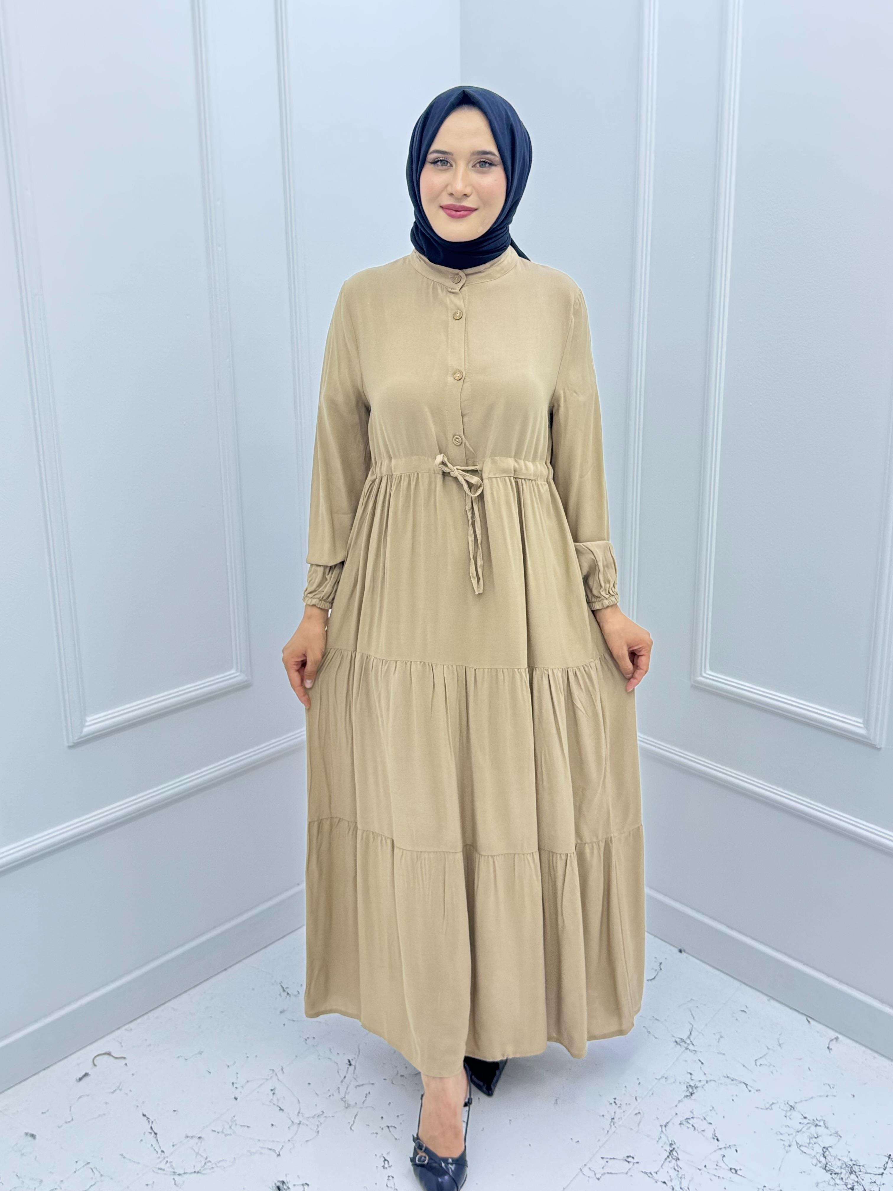 2390- PAMUK VİSKON KUMAŞ BELDEN BAĞLAMALI YARIYA KADAR DÜĞMELİ ELBİSE  VİZON