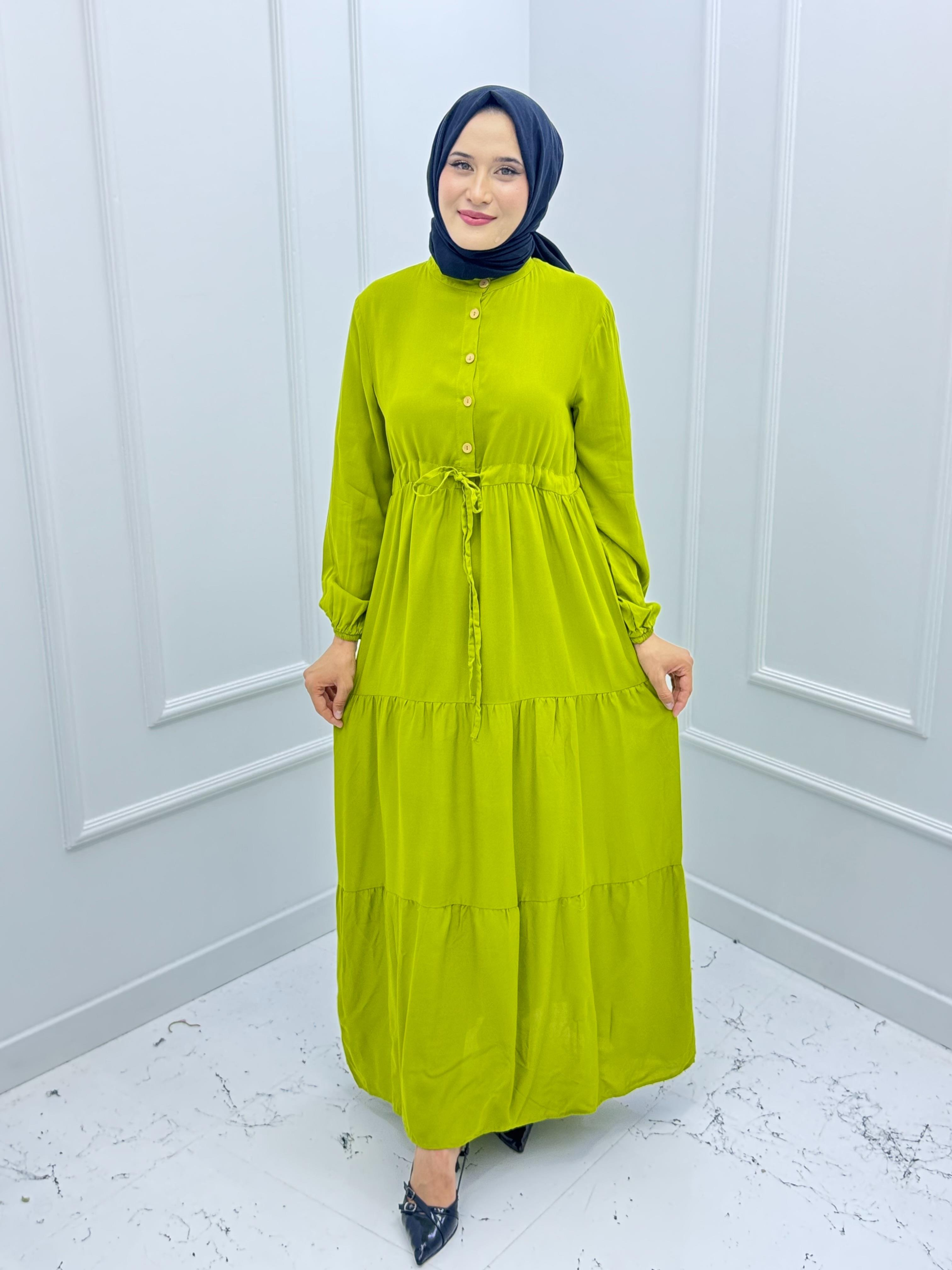 2390- PAMUK VİSKON KUMAŞ BELDEN BAĞLAMALI YARIYA KADAR DÜĞMELİ ELBİSE YAĞ YEŞİLİ (2390)