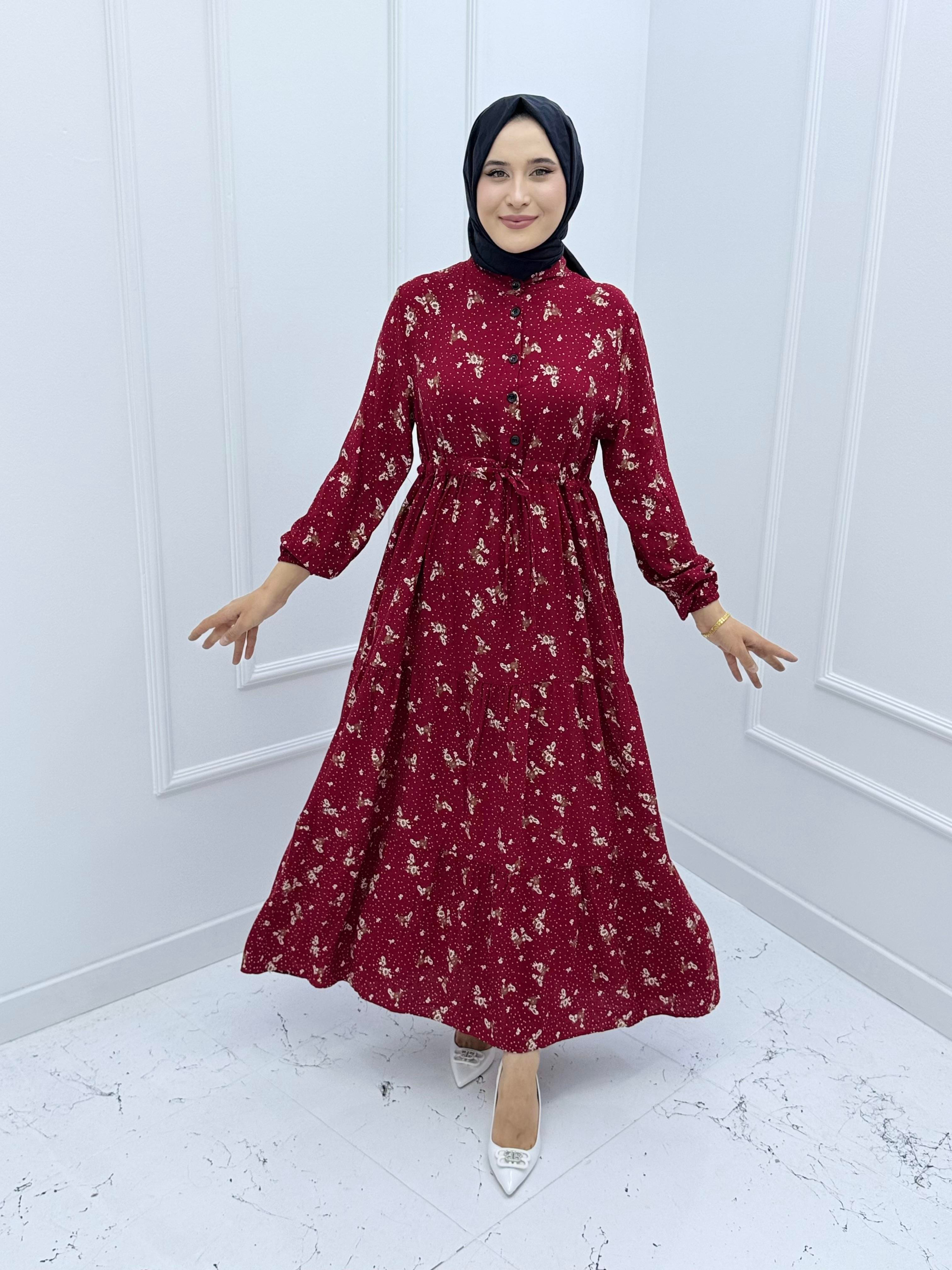 4380 ÇİÇEK DESENLİ YARIYA KADAR DÜĞMELİ BELDEN BAĞLAMALI VİSKON ELBİSE KIRMIZI