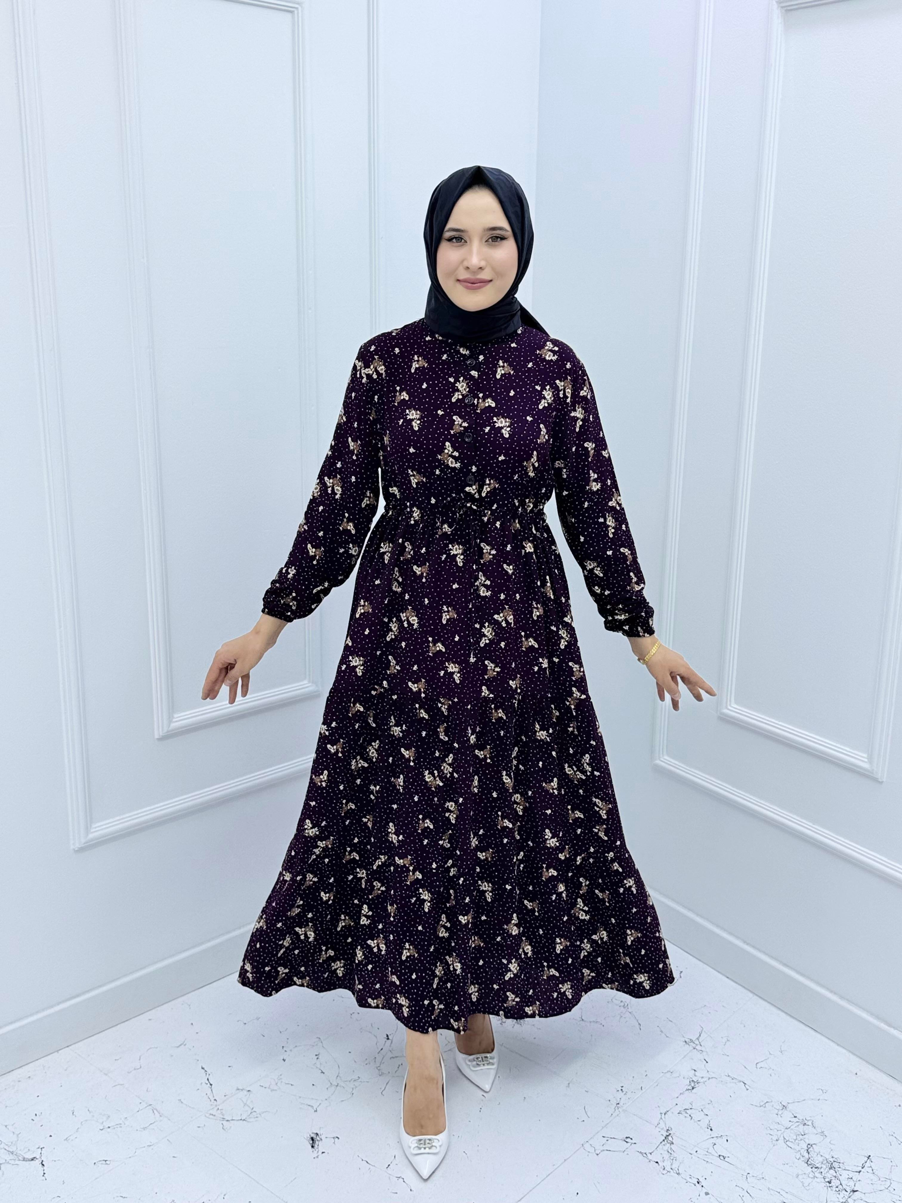 4380 ÇİÇEK DESENLİ YARIYA KADAR DÜĞMELİ BELDEN BAĞLAMALI VİSKON ELBİSE MÜRDÜM