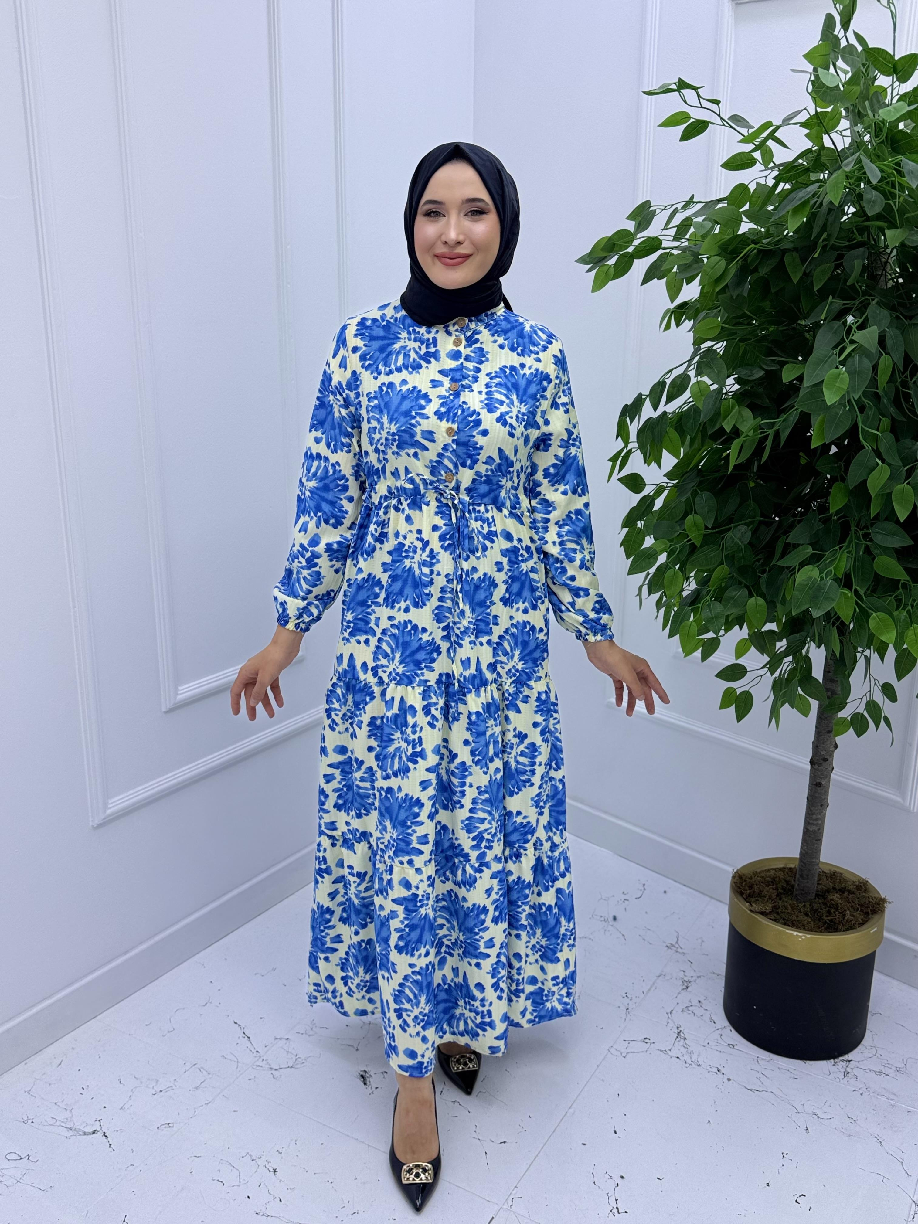 4385 KAŞ KUMAŞ BOYDAN ELBİSE BELDEN BAĞLAMALI ÇİÇEK DESENLİ ELBİSE MAVİ (4385)