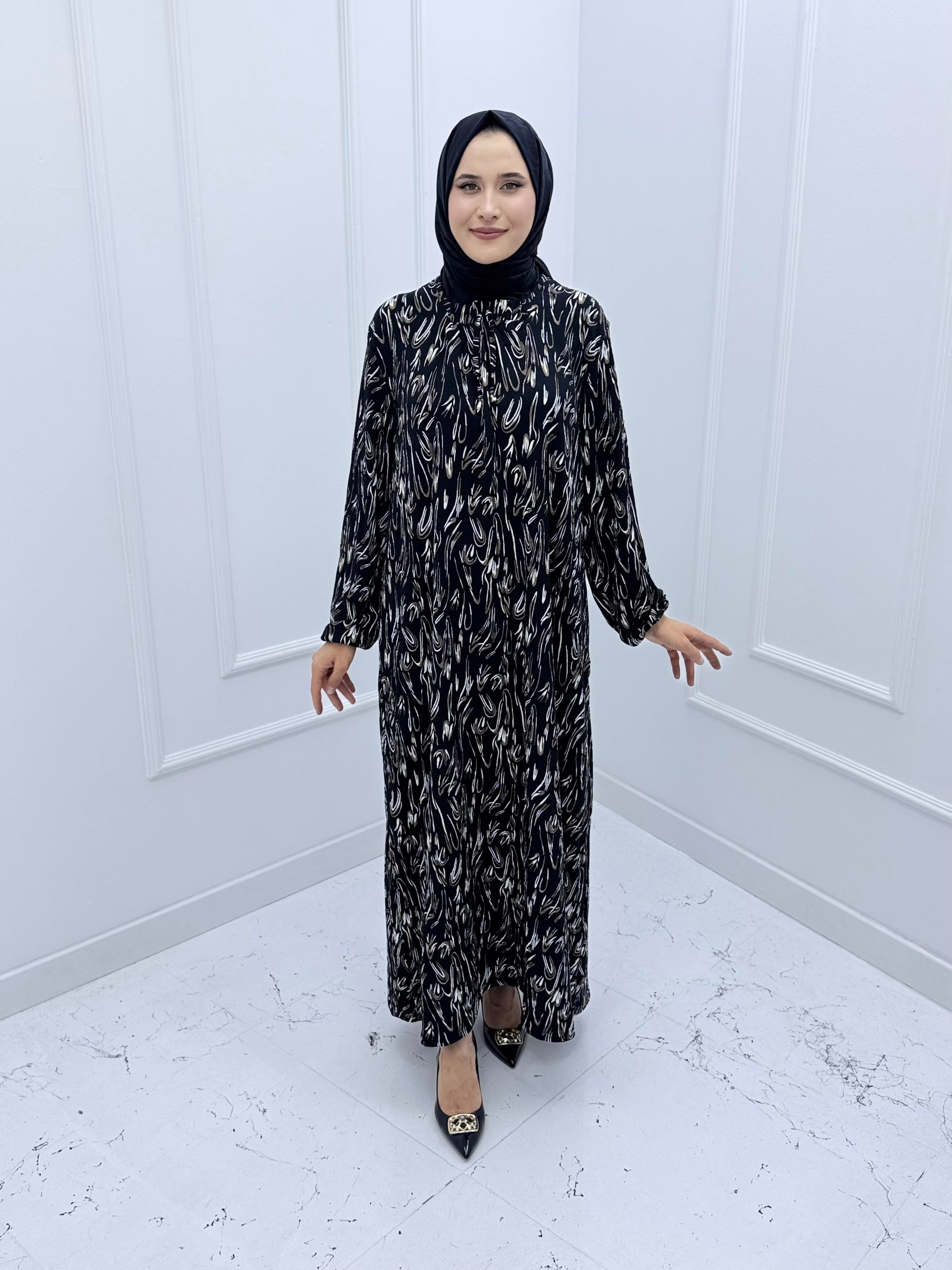 4934 KARİN KUMAŞ DESENLİ ELBİSE  SİYAH