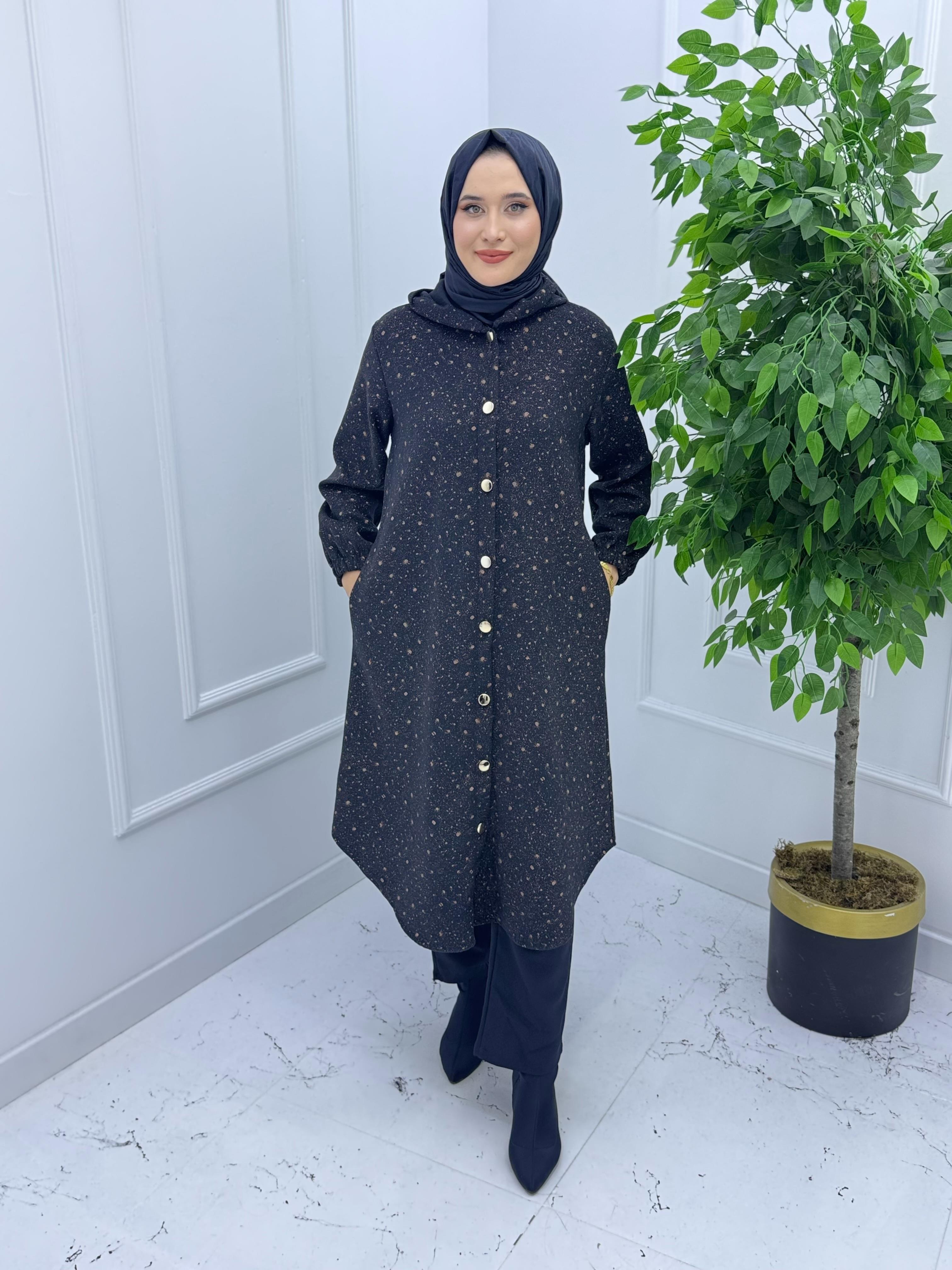 4958 KAŞE KUMAŞ BOYDAN DÜĞMELİ KAPŞONLU CEKET SİYAH-KAHVERENGİ (4958)