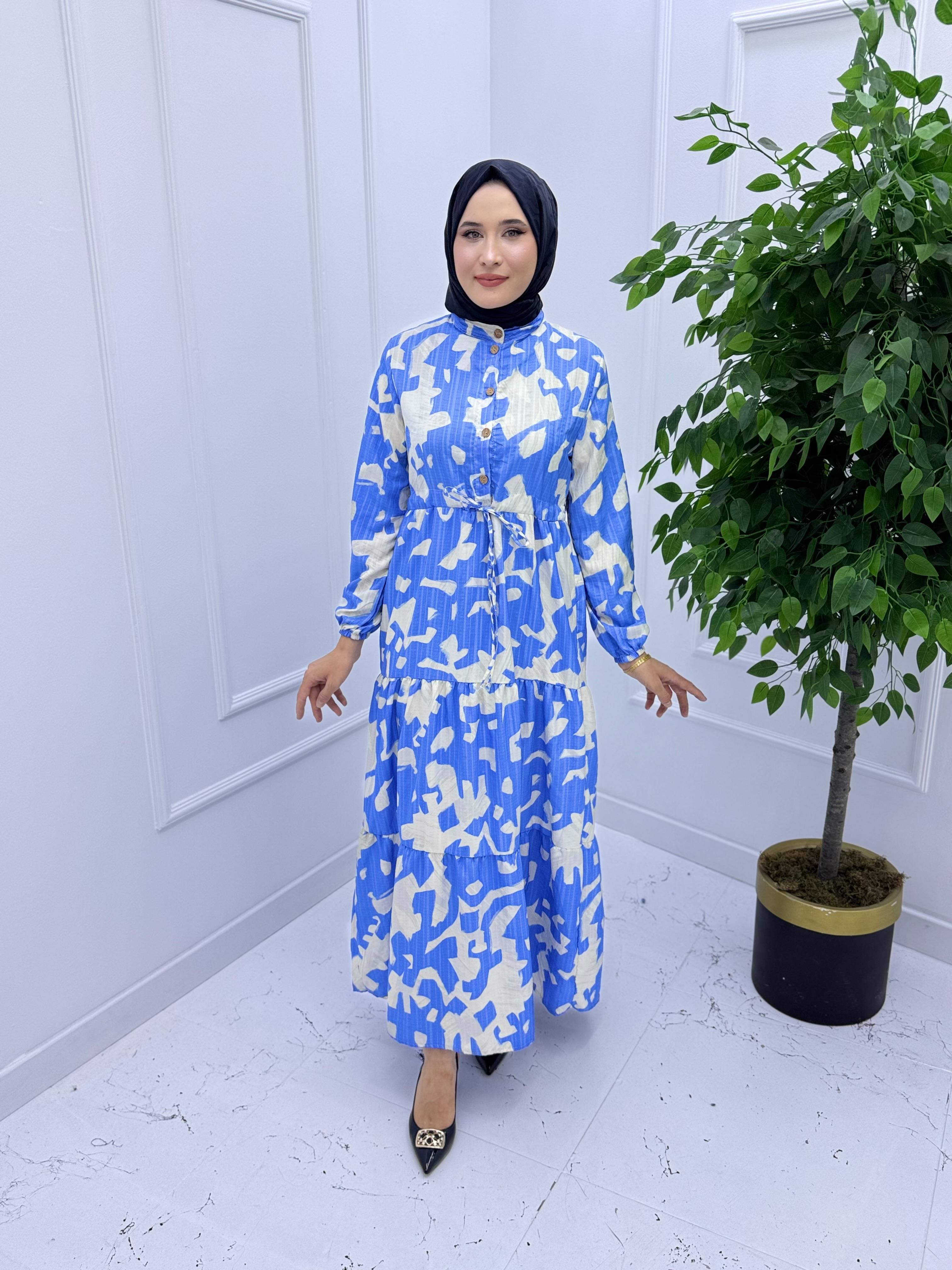 5467 MERMER DESEN YARIYA KADAR DÜĞMELİ BELDEN BAĞLAMALI ELBİSE MAVİ (5467)