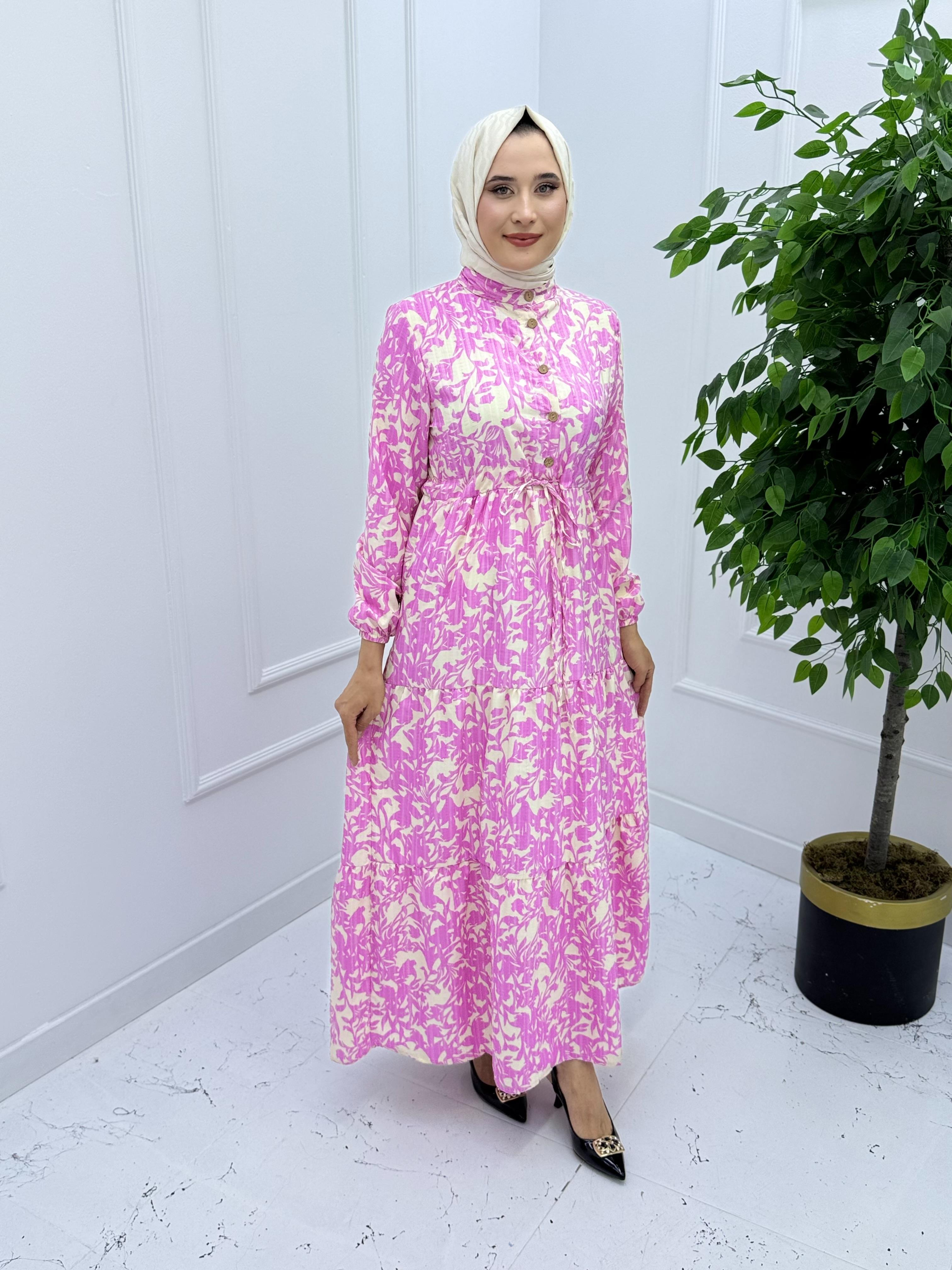 7580 KAŞ KUMAŞ YARIYA KADAR DÜĞMELİ BELDEN BAĞLAMALI ÇİLEK ELBİSE PEMBE (7580)