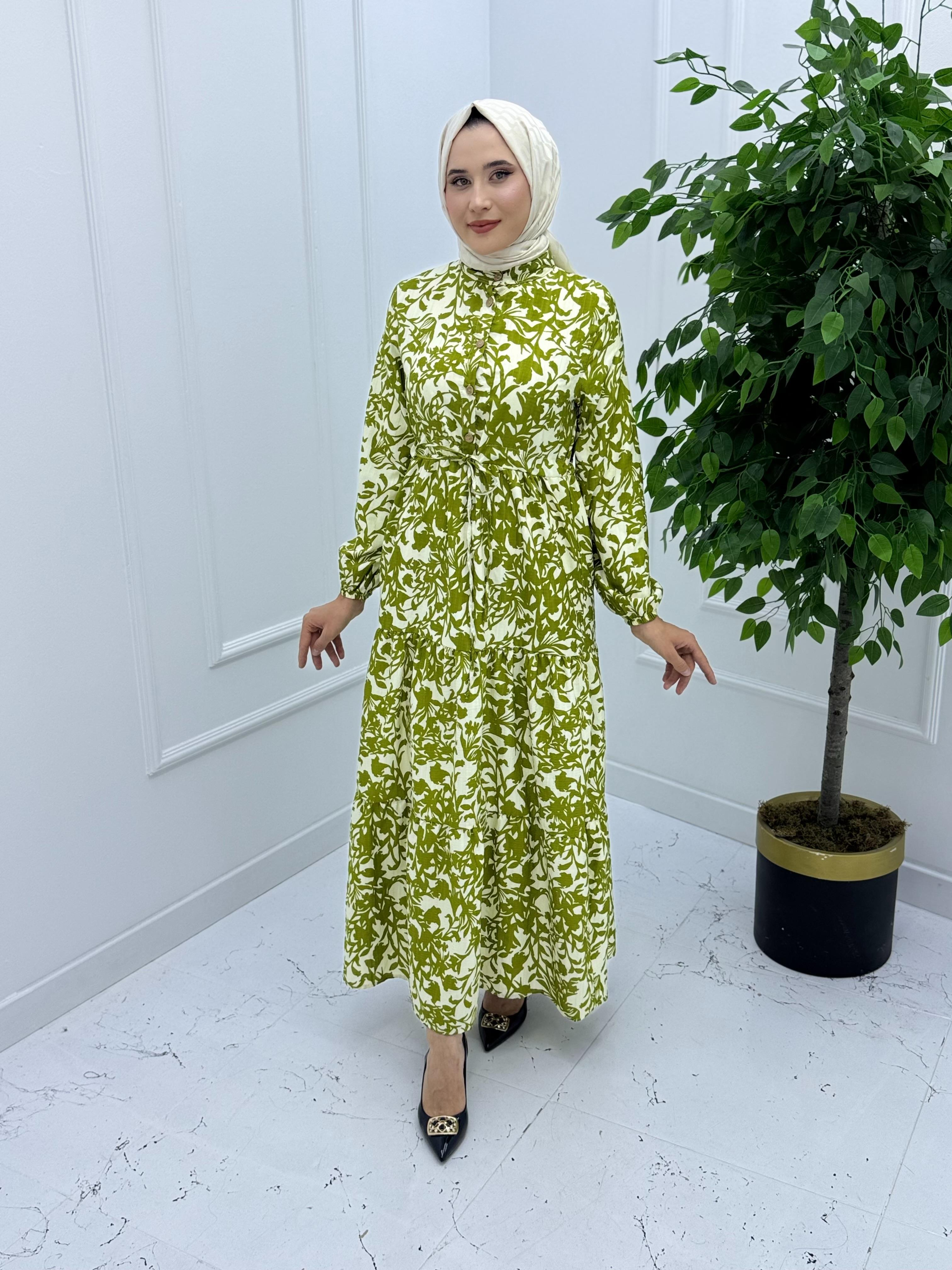 7580 KAŞ KUMAŞ YARIYA KADAR DÜĞMELİ BELDEN BAĞLAMALI ÇİLEK ELBİSE YAĞ YEŞİLİ (7580)