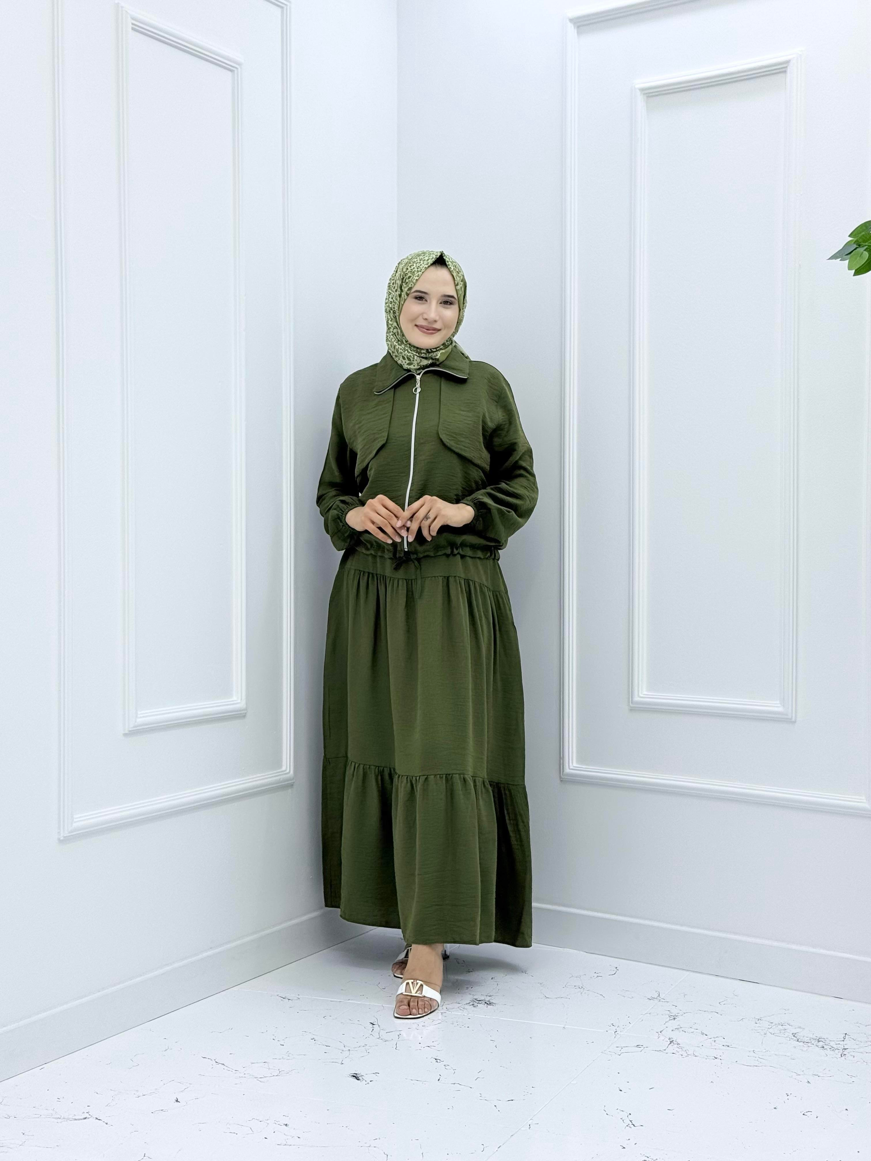 9278 AYROBİN KUMAŞ SIFIR KOLLU ELBİSE CEKETLİ TAKIM HAKİ (9278)