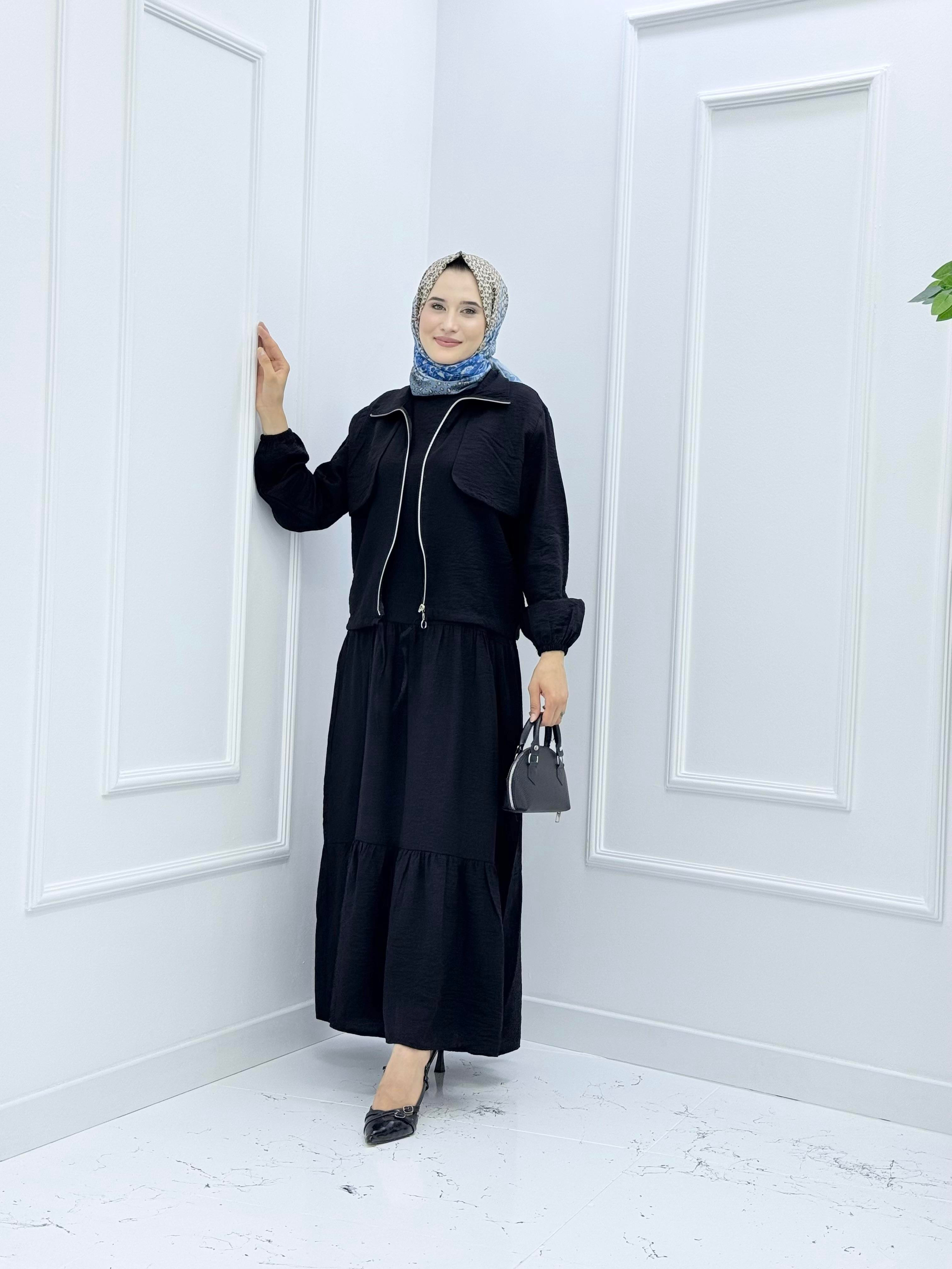 Ayrobin kumaş takım, hafif, dökümlü ve kırışmayan yapısıyla hem şıklık hem de konfor sunan bir giyim seçeneğidir. Genellikle tunik-pantolon ya da ceket-pantolon şeklinde kombinlenen bu takımlar, özellikle yaz ve bahar aylarında tercih edilir. Ayrobin kumaşın nefes alabilen ve ütü istemeyen yapısı sayesinde günlük kullanıma ve seyahatlere uygundur. Tesettür giyimde de sıkça kullanılır ve zarif bir duruş sağlar. Hem rahat hem şık bir görünüm arayanlar için ideal bir takımdır. GÖĞÜS BEDEN ÖLÇÜLERİ (ELBİSE) GÖĞÜS BEDEN ÖLÇÜLERİ (CEKET) 40-42:100CM 40-42:116CM 44-46:106CM 44-48:118CM 48-50:110CM 48-50:122CM 52-54:124CM 52-54:128CM ELBİSE BOY:140CM CEKET BOY:58CM MANKEN BOY : 1.70 MANKEN KİLO : 60 MANKEN ÜZERİNDEKİ BEDEN :40-42