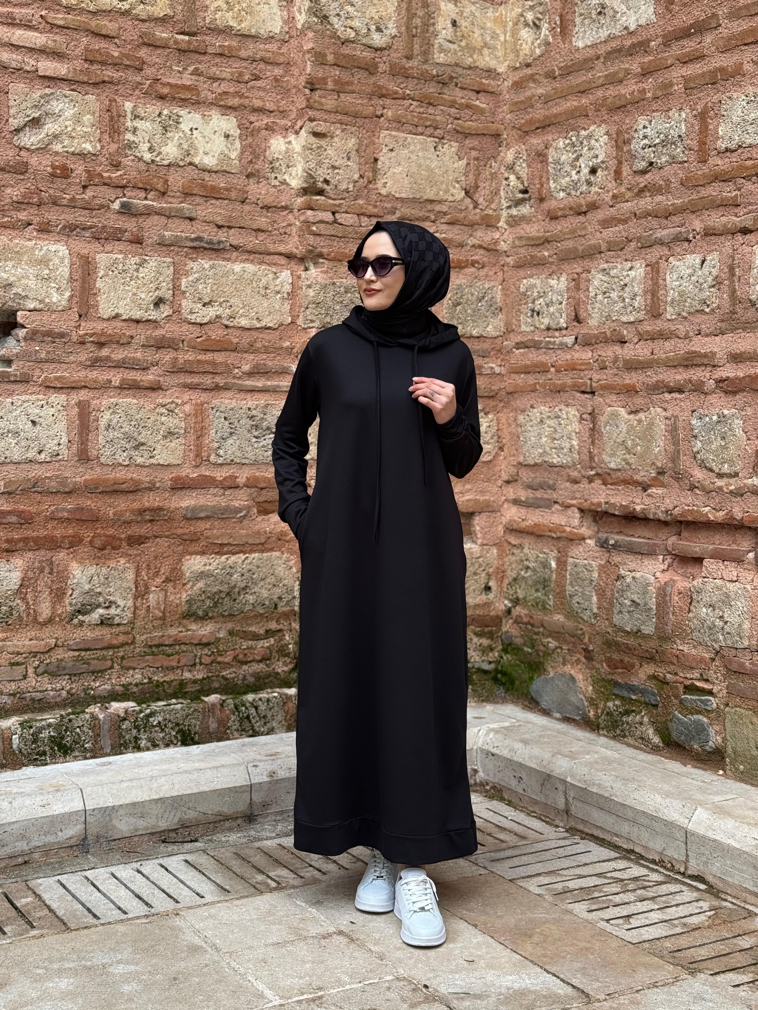 İKİ İPLİK KAPŞONLU SPOR ELBİSE SİYAH