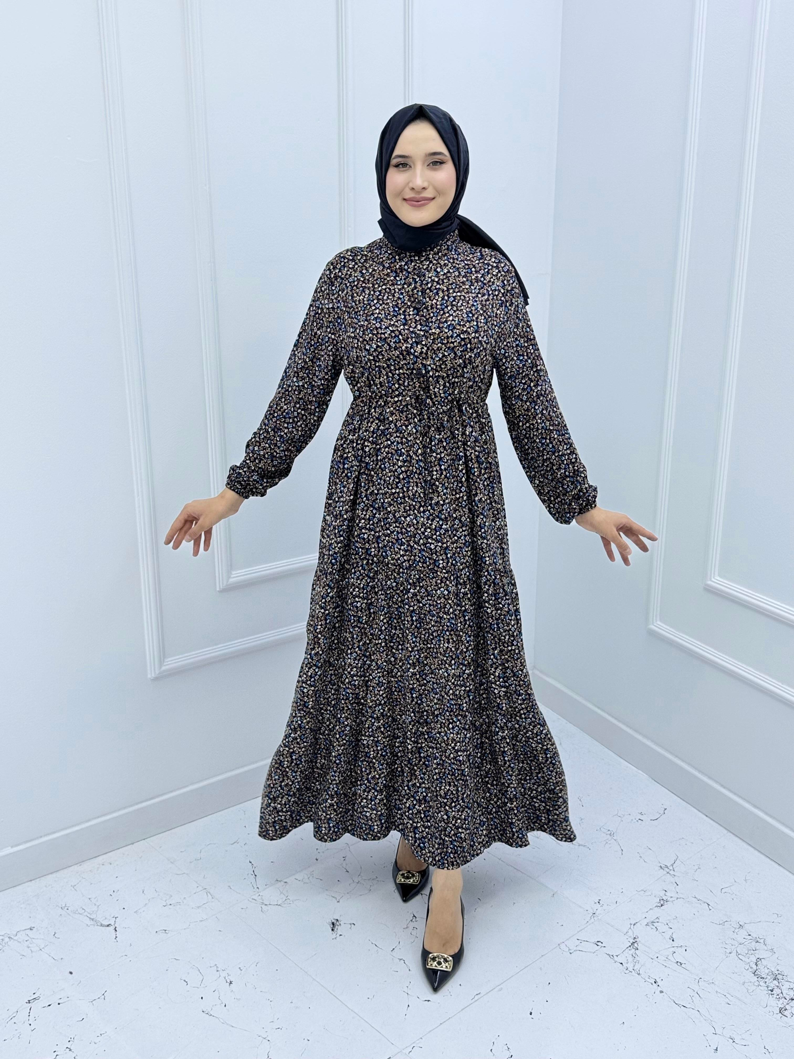 3091 YARIYA KADAR DÜĞMELİ BELDEN BAĞLAMALI ÇITIR DESEN ELBİSE MAVİ (3091)