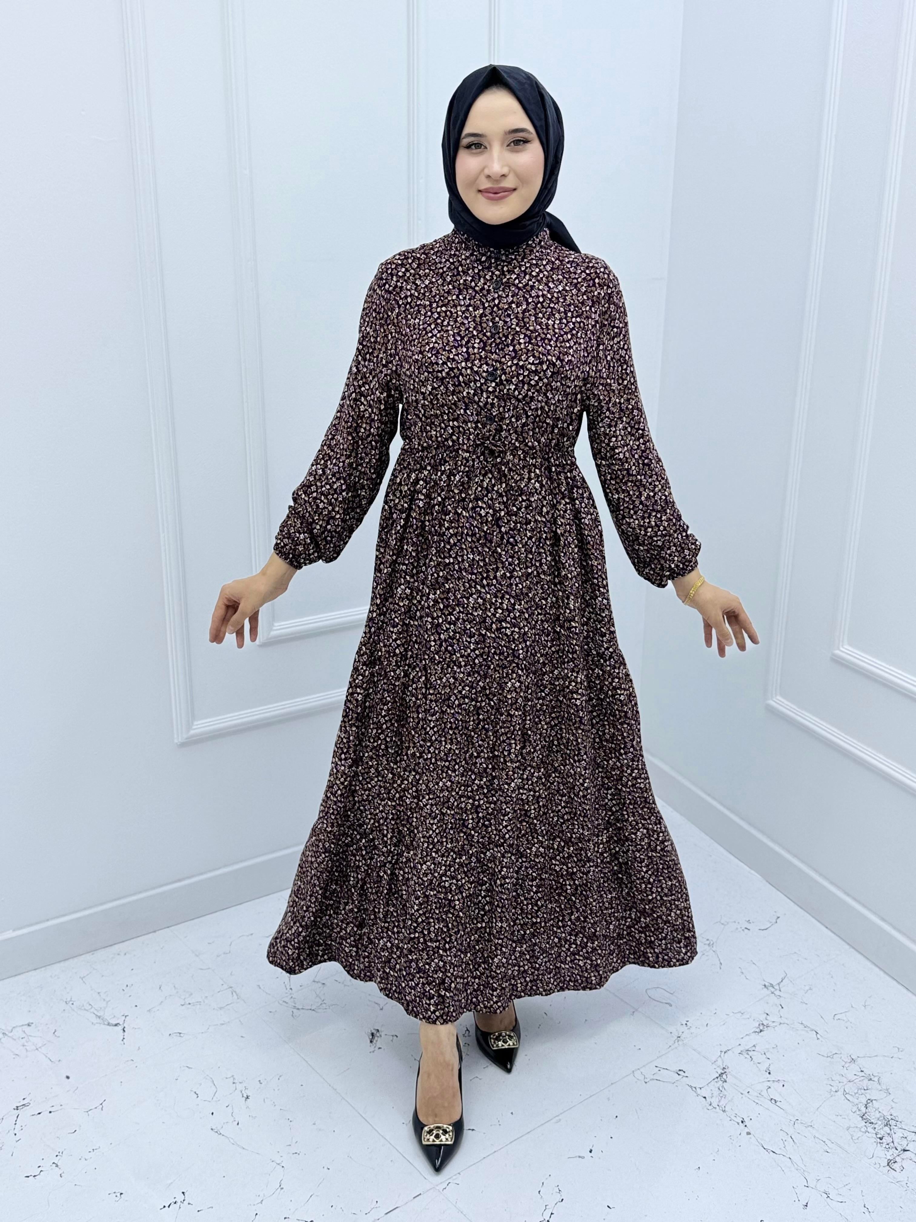 3091 YARIYA KADAR DÜĞMELİ BELDEN BAĞLAMALI ÇITIR DESEN ELBİSE MOR (3091)